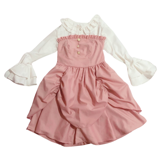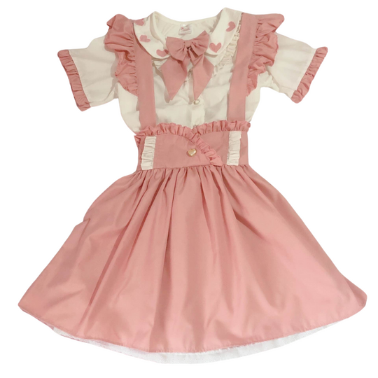 This coordinate contains one jumper skirt, blouse, and ribbon brooch. It has faux pearl buttons with lining. It also includes pongee lining with an eyelet lace trim on the jumper skirt. This is strictly sold as a set.PHP 3500