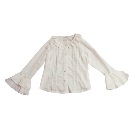 This blouse features a crew neck, with ruffles beneath it. Donning pintucks, it is buttoned with lined pearls. It also features hime-sleeves.PHP 1850